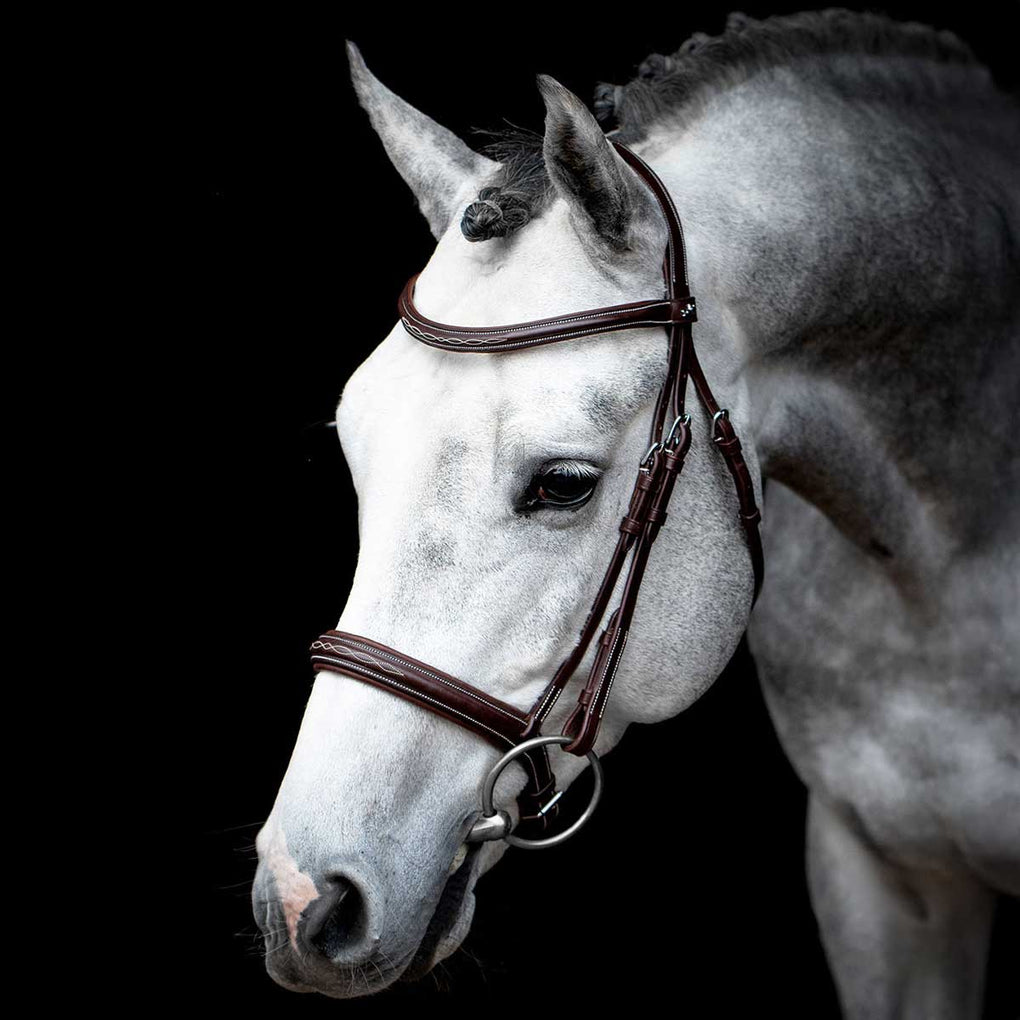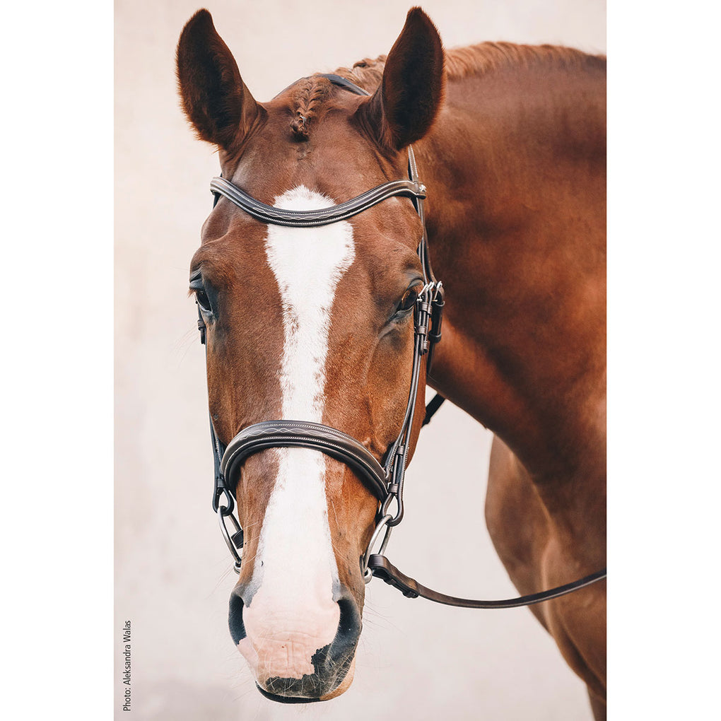 Schockemohle Montreal Select Anatomical Bridle features a softly padded anatomically shaped noseband, crown piece with a distinctive cut and soft padding to reduce pressure. The throat latch is uniquely designed and shaped to correctly accommodate the horses neck anatomy. This beautiful bridle is elegantly stitched for an exquisitely refined appearance.