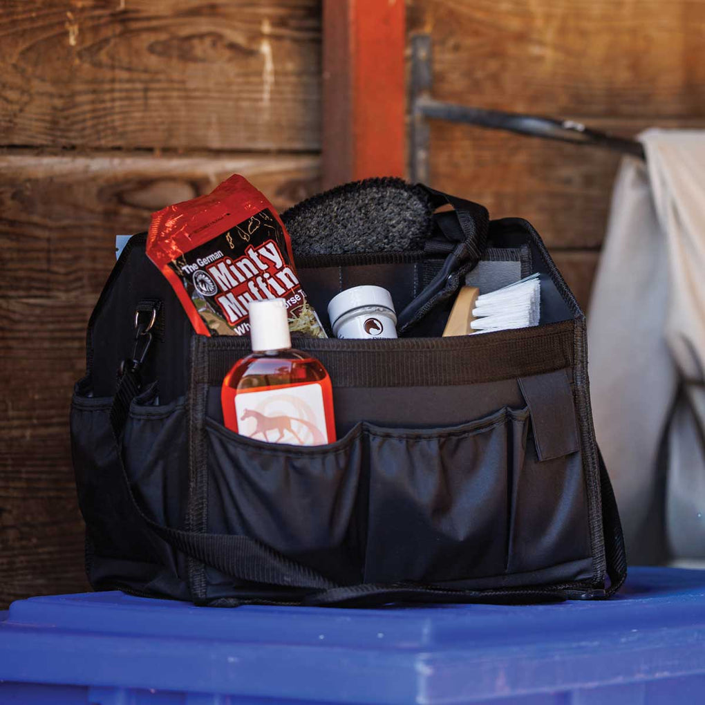 This Nylon Grooming Tote will keep you organized in the barn, in the trailer or even at home. Large spots are perfect for taller sprays, shampoo bottles or sponges & exterior elastic pockets hold all different sized grooming tools. Mesh bottom allows moisture and dirt to just fall through.