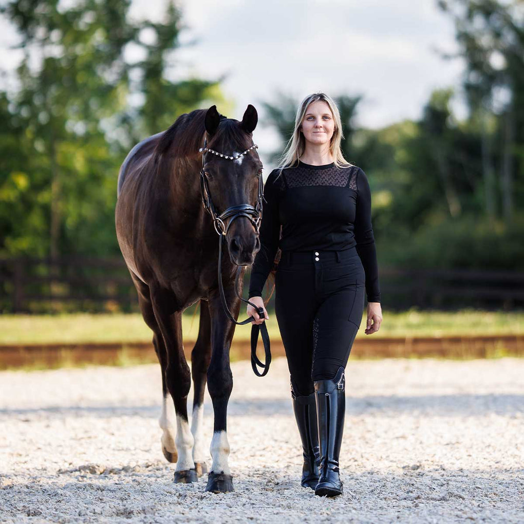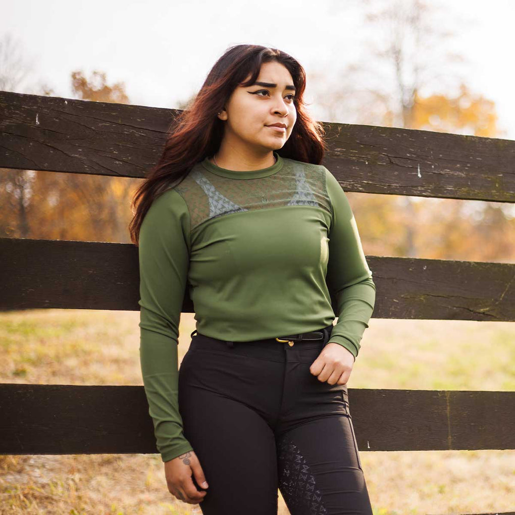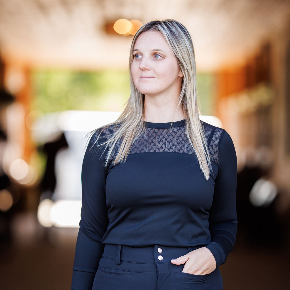 The Macha Sports Danielle Lace Crew Ladies Long Sleeve Top is designed with a flattering crew neckline and Macha's signature lace detail on the yoke for a touch of elegance. Crafted from a high-performance blend that offers stretch and a comfortable sleek fit. This top is the perfect balance of sporty function and feminine style that combines performance fabric with chic detailing whether you're at the barn or out on the town.