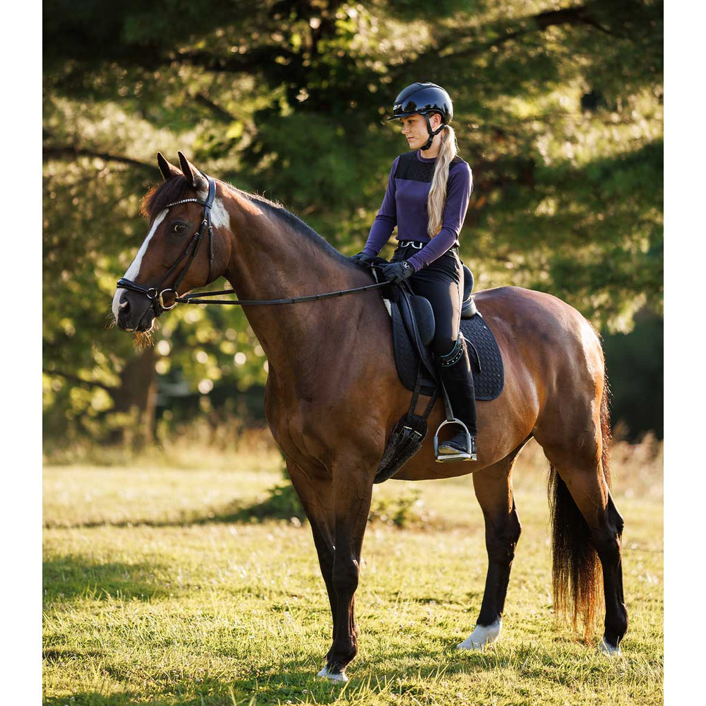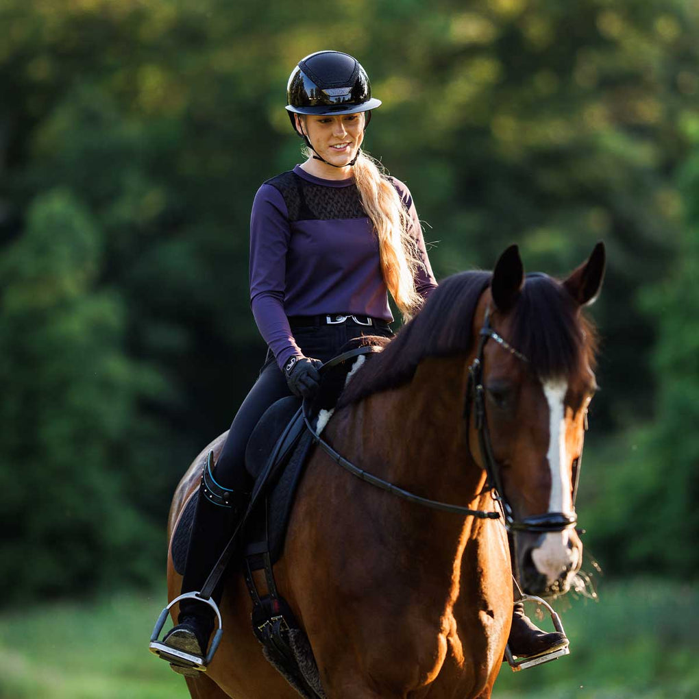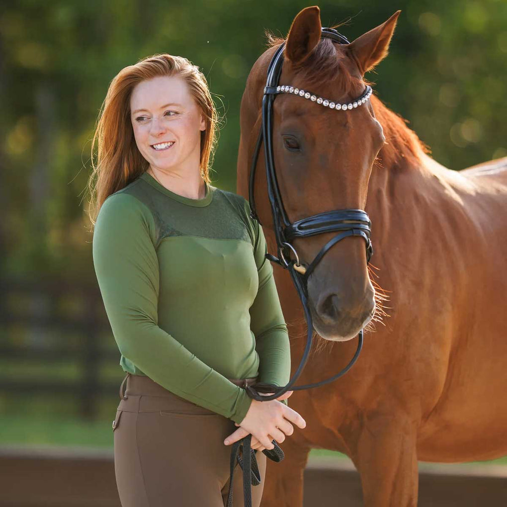 The Macha Sports Danielle Lace Crew Ladies Long Sleeve Top is designed with a flattering crew neckline and Macha's signature lace detail on the yoke for a touch of elegance. Crafted from a high-performance blend that offers stretch and a comfortable sleek fit. This top is the perfect balance of sporty function and feminine style that combines performance fabric with chic detailing whether you're at the barn or out on the town.