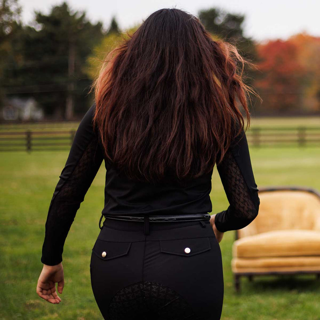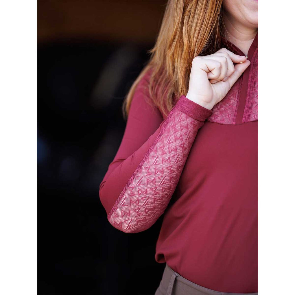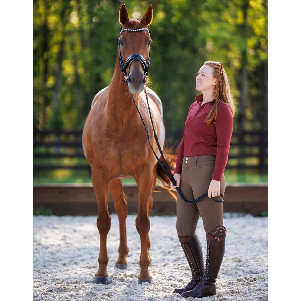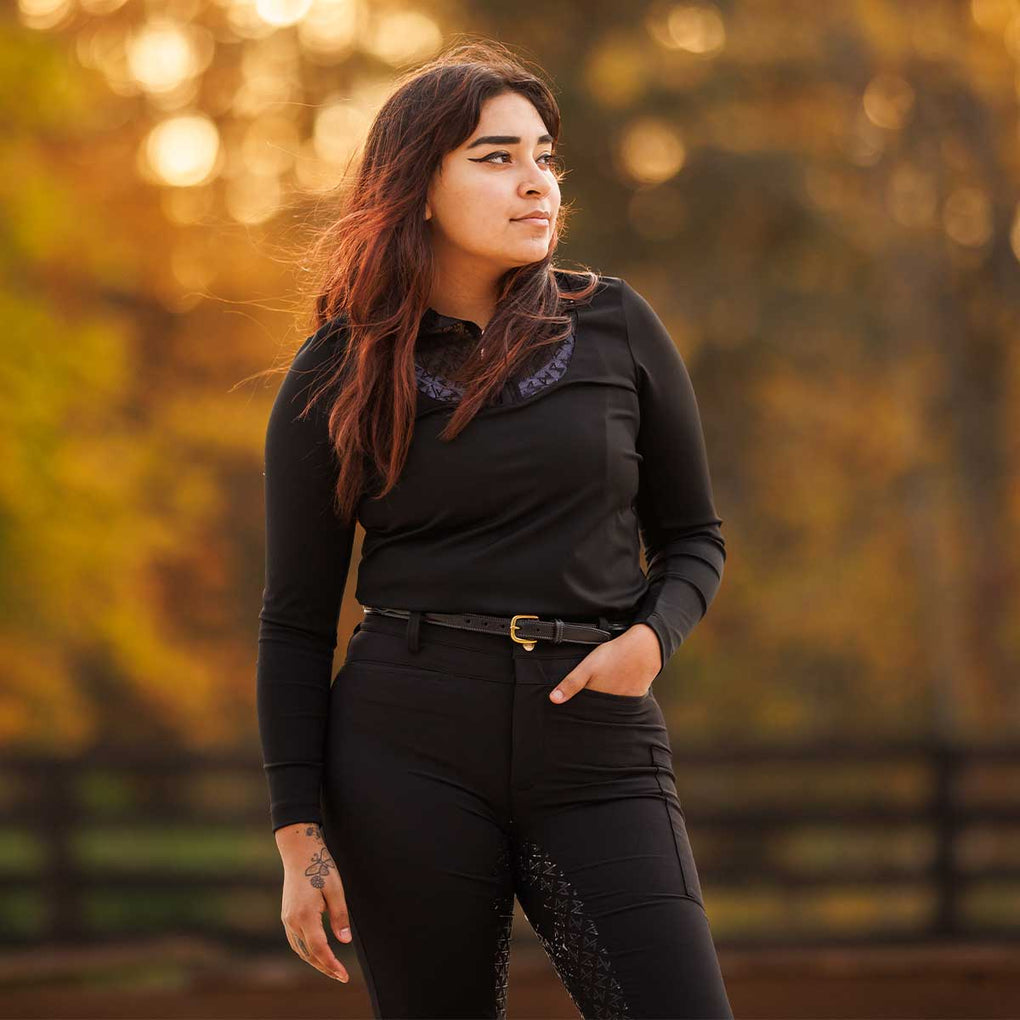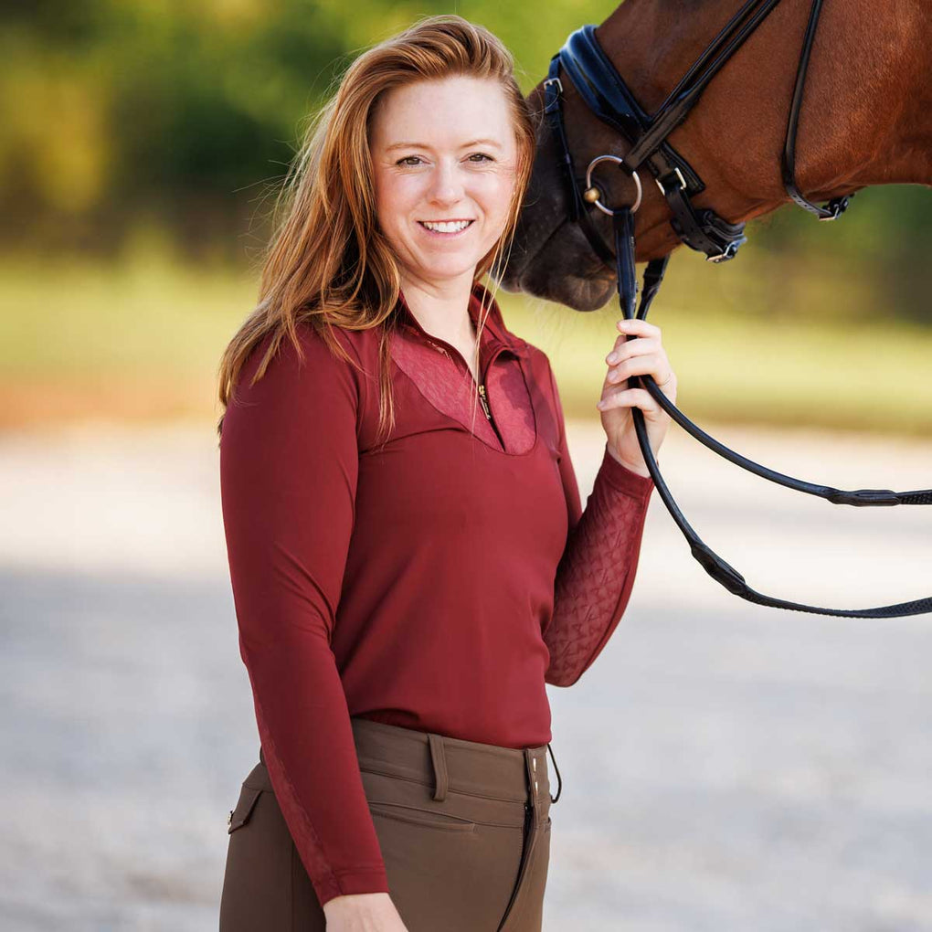 The Macha Sports Sarah Quarter Zip Mock Neck Ladies Top is the perfect blend of performance and polished style for riding, and everyday wear. Designed with a flattering mock neck and a versatile quarter zip this top transitions seamlessly from the barn to beyond. Its sleek silhouette and modern design deliver confidence and comfort in every setting. Balancing function and fashion the Sarah Quarter Zip Mock Neck is an essential piece for riders and athletes who want effortless style and everyday performance.