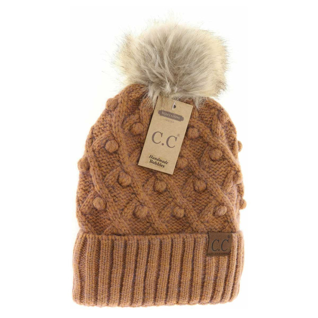 The CC Beanie Bobble Knit Fur Pom Ladies Beanie is the ultimate blend of warmth with a playful style. Featuring trendy hand-knit bobble details throughout and topped with a chic faux fur pom makes this beanie is designed to turn heads. The soft lining provides extra insulation against chilly weather making it a practical choice for the cold weather and a perfect addition to your winter wardrobe.