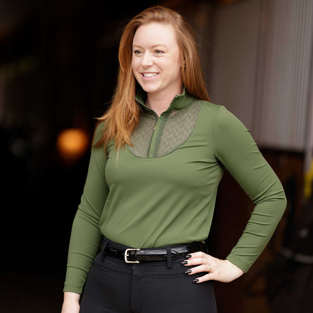 The Macha Sports Sarah Quarter Zip Mock Neck Ladies Top is the perfect blend of performance and polished style for riding, and everyday wear. Designed with a flattering mock neck and a versatile quarter zip this top transitions seamlessly from the barn to beyond. Its sleek silhouette and modern design deliver confidence and comfort in every setting. Balancing function and fashion the Sarah Quarter Zip Mock Neck is an essential piece for riders and athletes who want effortless style and everyday performance.