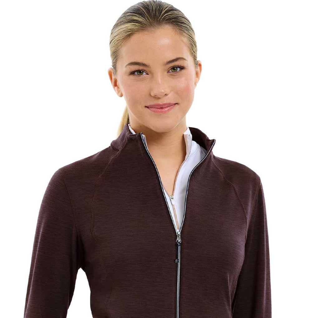 The RJ Classics Kira Ladies Jacket in Plum Perfect Heather is a modern layering essential for cool-weather rides and barn days. Designed with wicking stretch performance fabric this technical jacket offers comfort without compromising style. Lightweight yet functional is perfect as a stand-alone piece or layered under outerwear for added warmth. This versatile jacket blends both function and fashion making it a must-have for fall layering and everyday riding comfort.