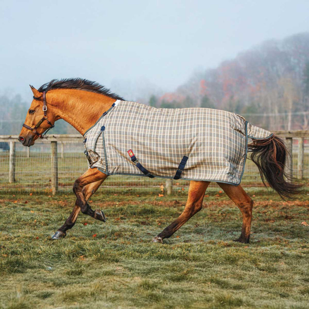 The 5/A Baker heavyweight turnout blanket is great for cold winters! 400 gm of insulation. Featuring gusseted shoulders to allow freedom of movement during play time, elastic hind leg straps to keep the blanket in place, bias surcingle straps and a tail flap. The Baker Turnout Blanket is unique as it allows perspiration to pass through to the outside while maintaining its waterproof outer layer. This mix of breathability allows the horse to stay dry and comfortable during outside play. The outer shell is a 1,500 denier polyester rip stop fabric. The inner lining is a satin smooth lining that polishes the coat.