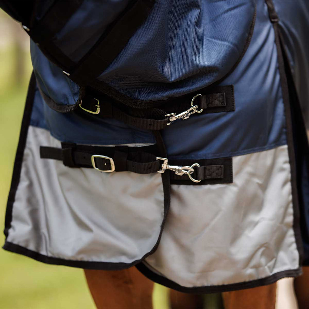 Protect your horse from the elements with the Gale Force Full Neck Turnout Blanket by Country Pride. Built with a tough 1680 denier waterproof outer shell, this lightweight horse blanket includes 100g of high loft poly-fill insulation-ideal for chilly weather without overheating. The attached full neck cover offers added warmth and protection, while shoulder gussets allow natural movement during turnout. Featuring an open front with double buckle and snap closures, bias surcingles, tail cover, and adjustable/removable elastic hind leg straps for a secure fit. The navy and grey two-tone design adds a stylish touch.