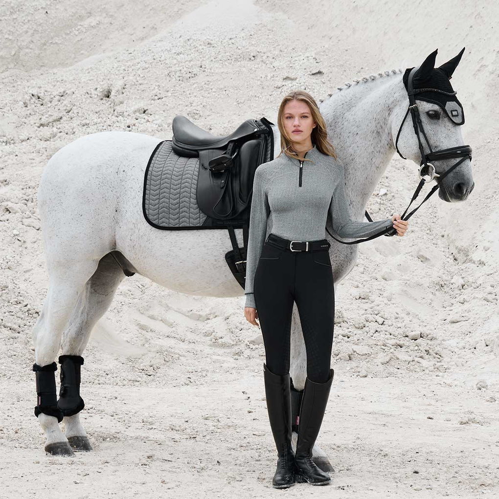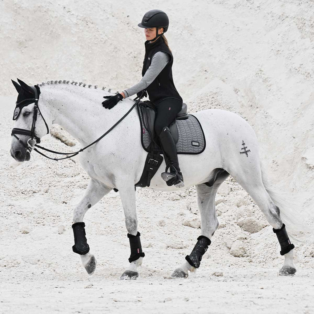 The LeMieux Aspen Dressage Saddle Pad in the elegant Herringbone collection is crafted from premium luxury fabric with LeMieux’s signature quilting. This pad combines refined style with functional performance with patent piping and badge adds a sophisticated touch while the soft suede-effect binding ensures a friction-free ride. Designed with elasticated D-rings and a reinforced girth protection area to offer a secure comfortable fit with long-lasting durability for both schooling and competition.