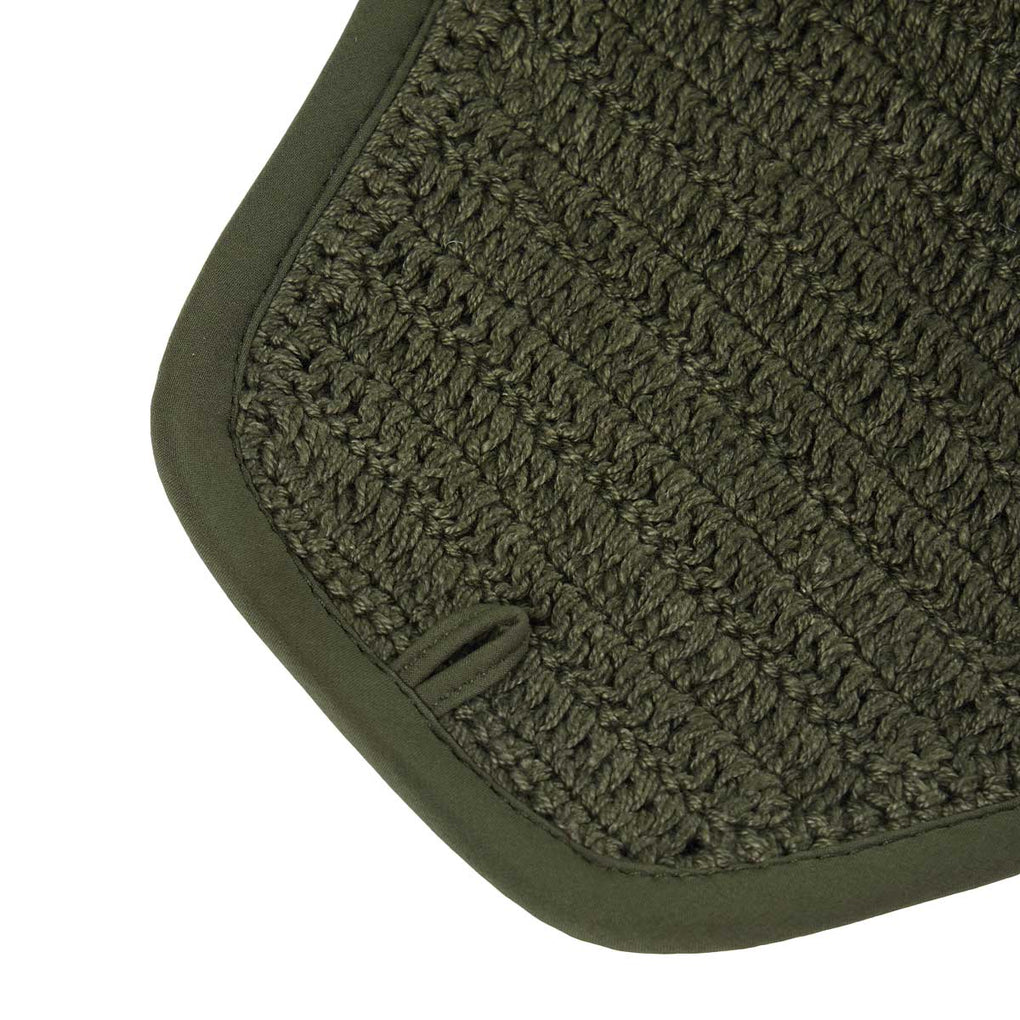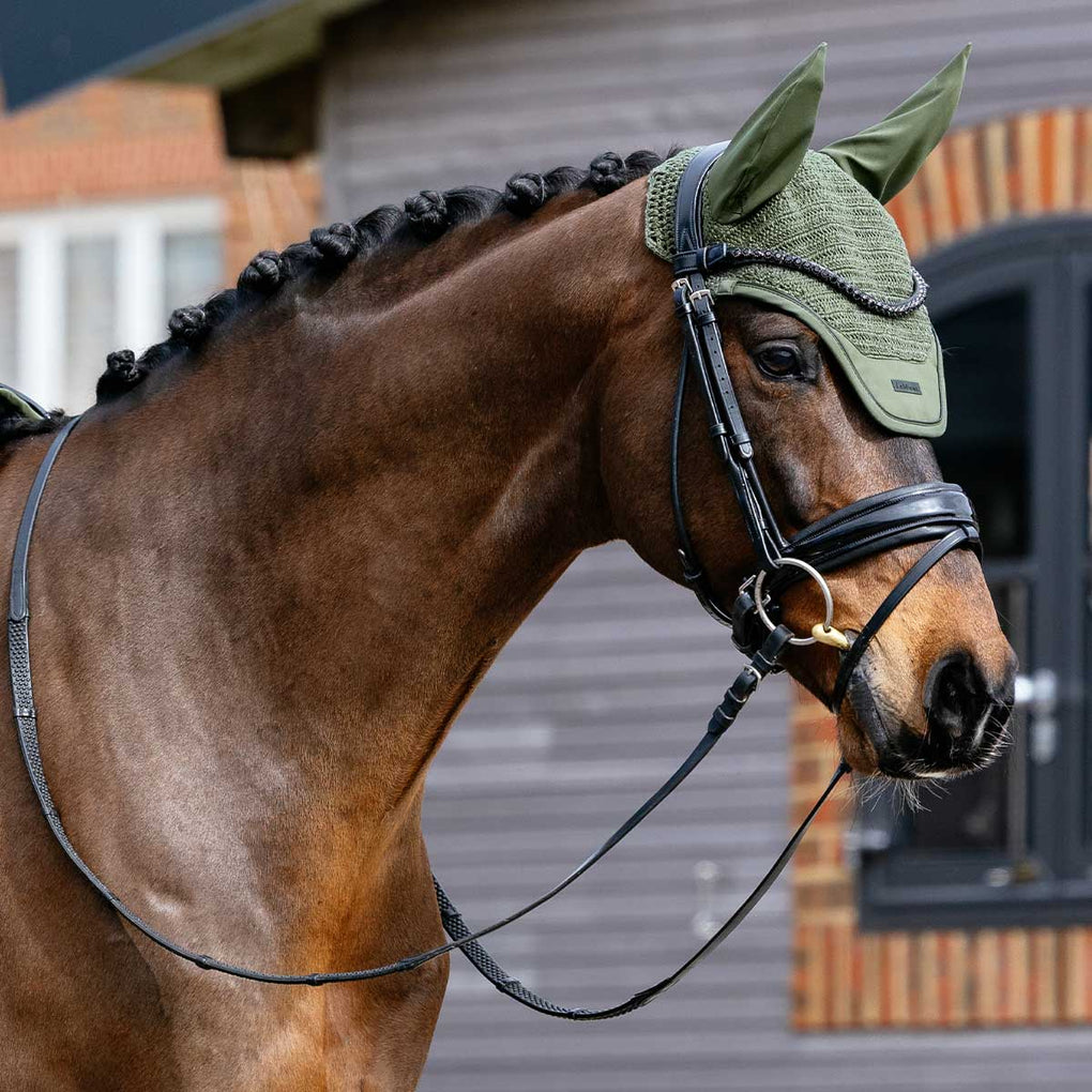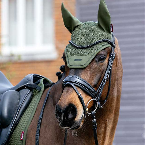 The LeMieux Essence Fly Hood in Pine Green combines style with everyday function to keep your horse comfortable and focused. Featuring a sleek cut and hand-crocheted construction in a patterned knit to offer exceptional breathability while maintaining a polished look. Finished with a coordinated soft-shell patch trim and matte silicone LeMieux branding makes it the perfect choice for riders who appreciate performance with refined detail.
