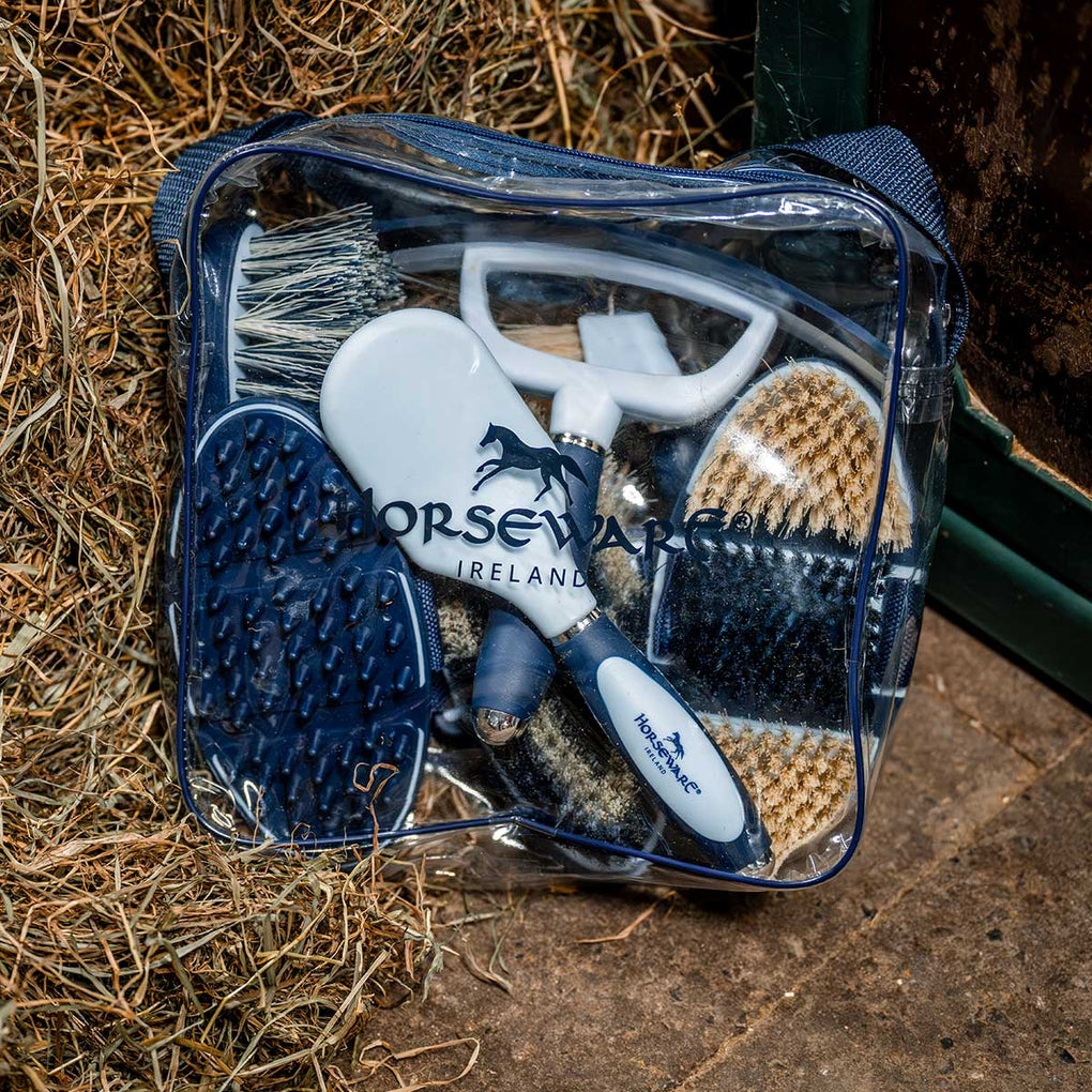 • Includes: Dandy Brush, Body Brush, Flexi Body Brush, Flexi Curry Comb, Hoof Pick with Brush, Sweat Scraper, and Mane & Tail Brush