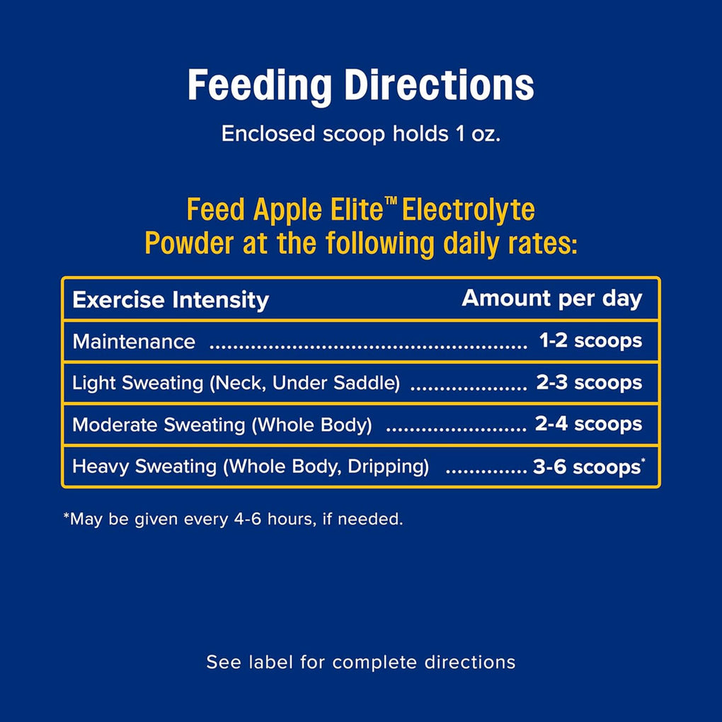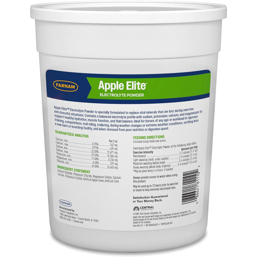 Apple Elite by Farnam is a high quality electrolyte supplement designed to aid in the prevention of dehydration in horses. Highly palatable in an easy-to-feed granular base with artificial apple flavoring.