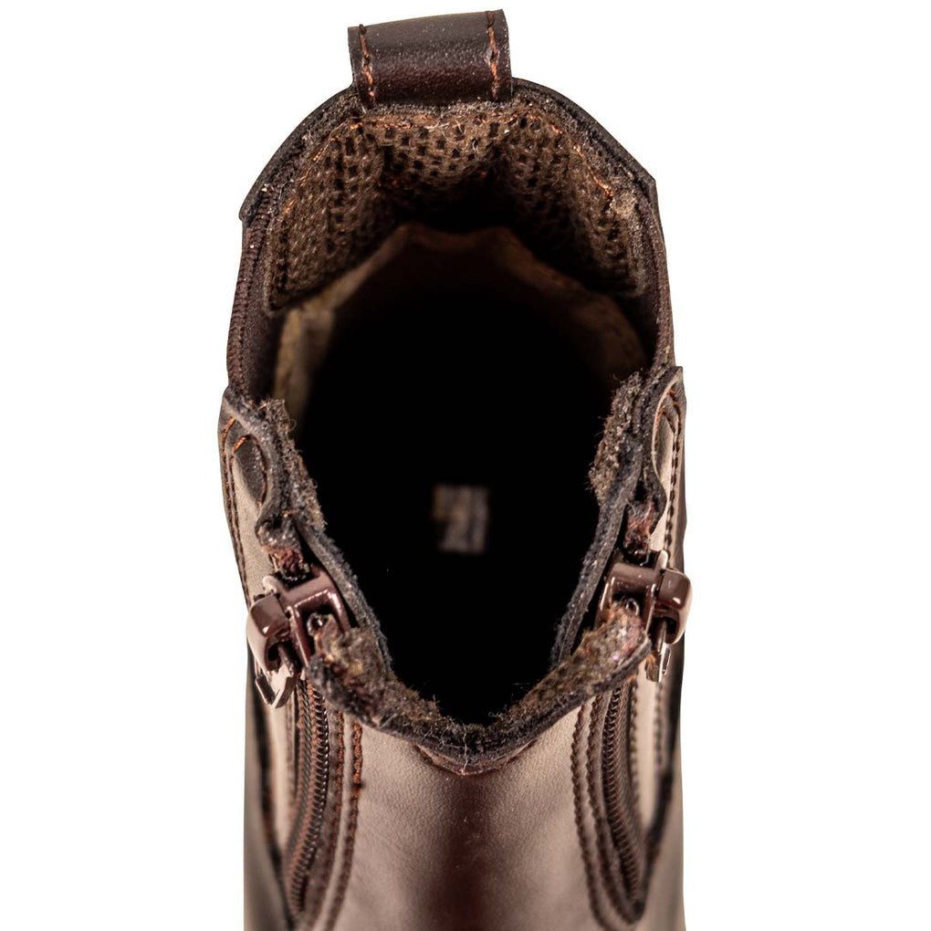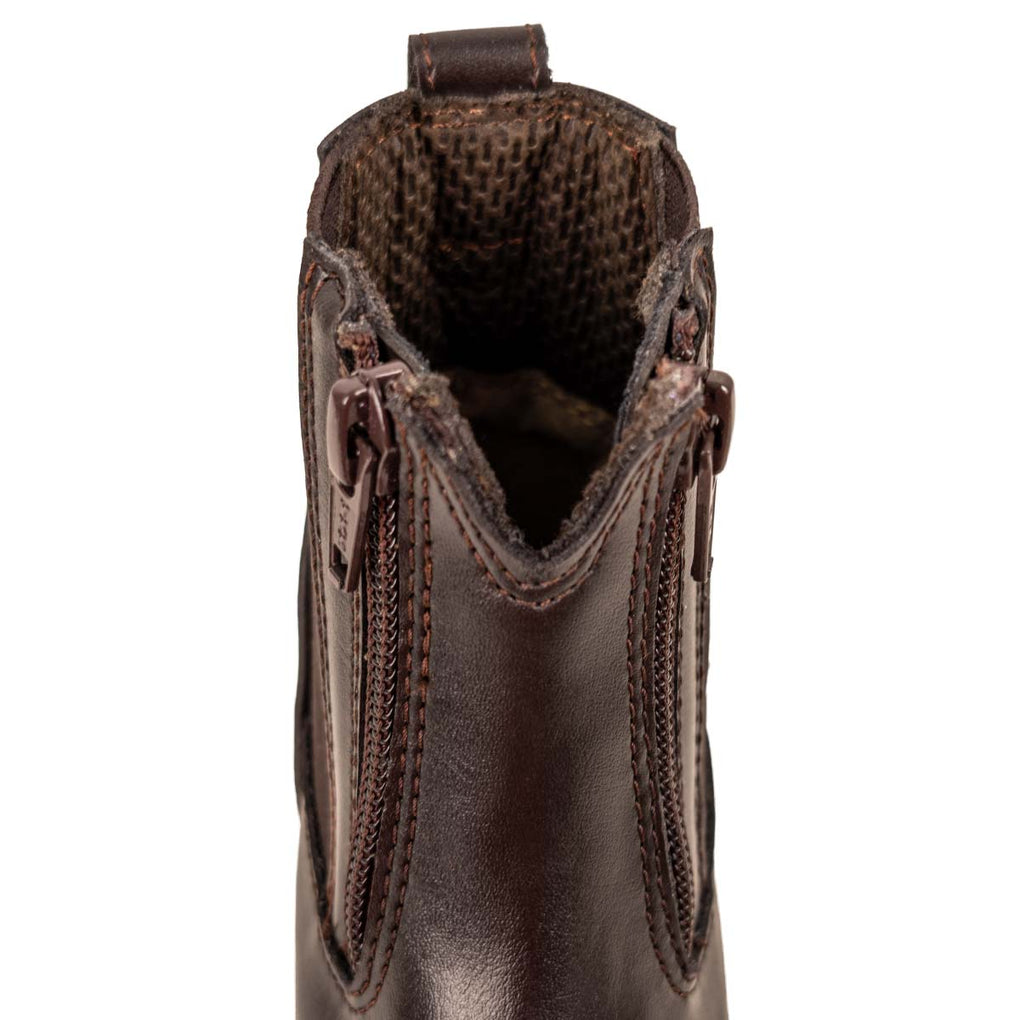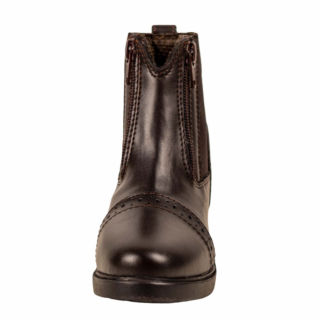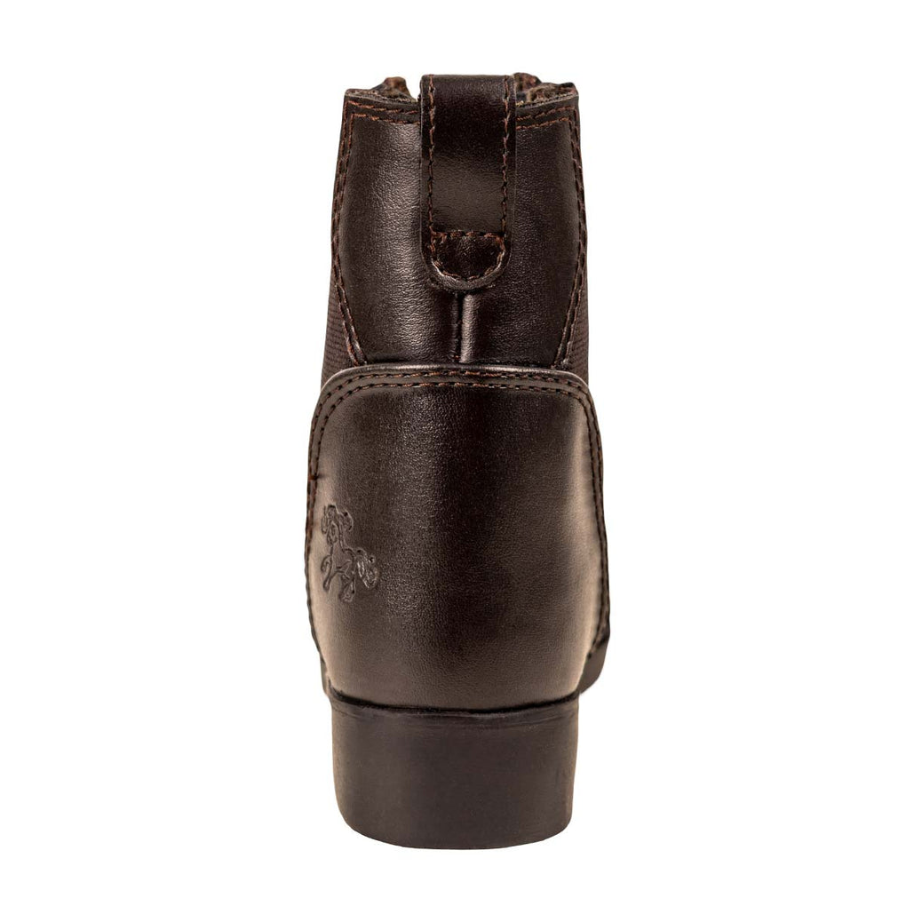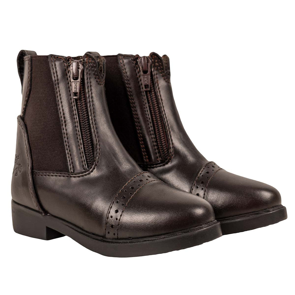 The Belle & Bow Norfolk Double Zip Toddler Paddock Boots brings a classic equestrian style to your littlest rider with a design that looks just like the big kids' version. Made from comfortable synthetic brown leather and a flexible rubber sole these boots offer a secure fit for tiny equestrians learning to dress themselves. The adorable punch toe detail and Belle Pony embossing add charming finishing touches making these boots a favorite for everything from first lesson to early short-stirrup adventures.