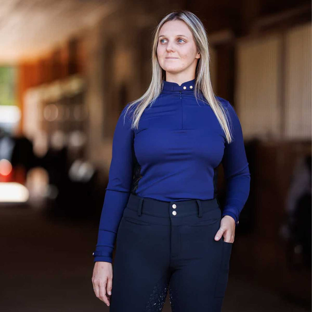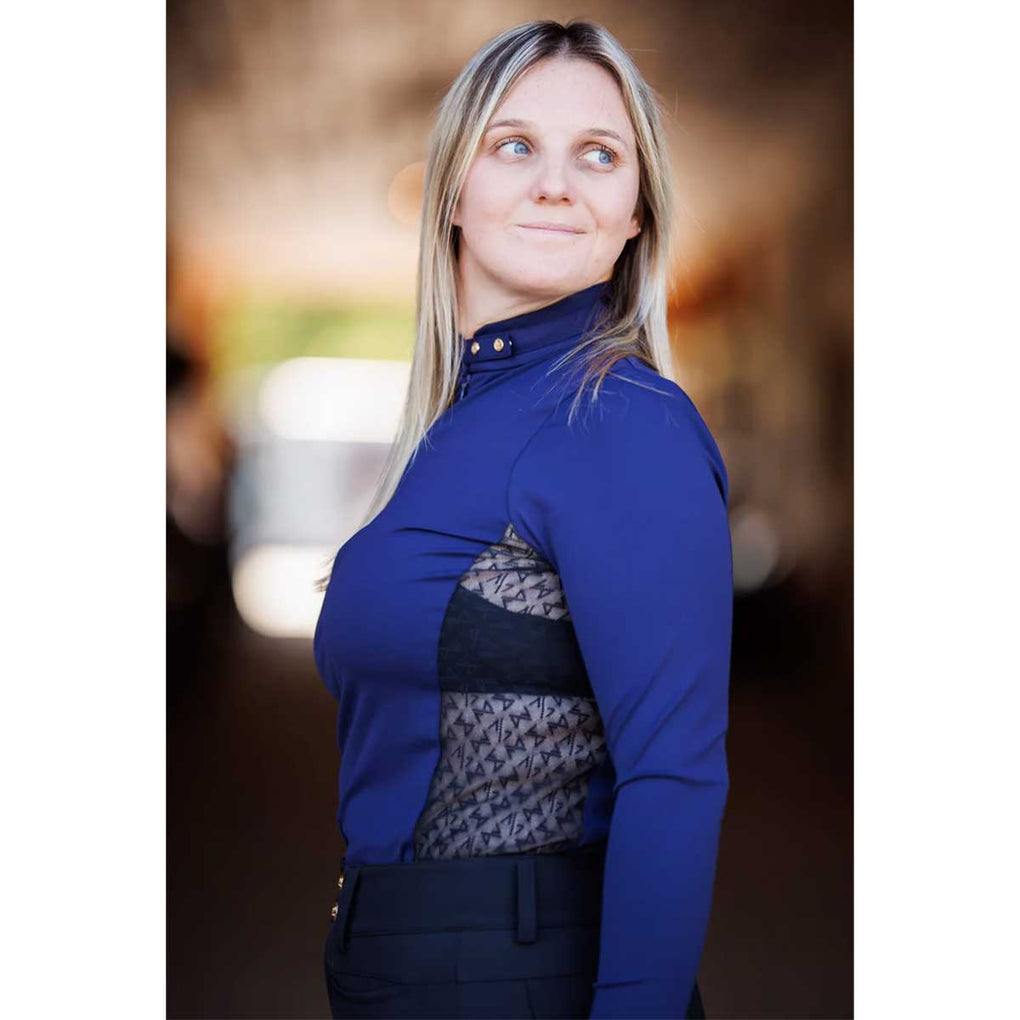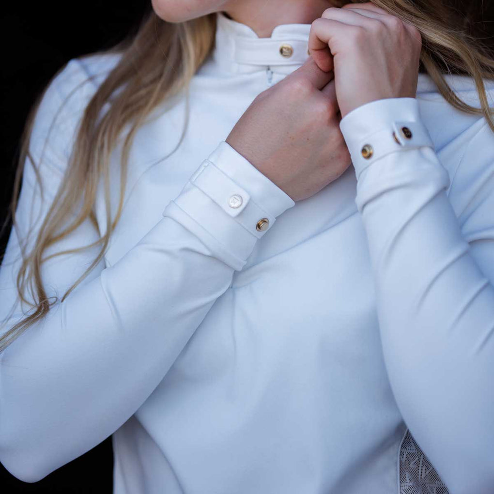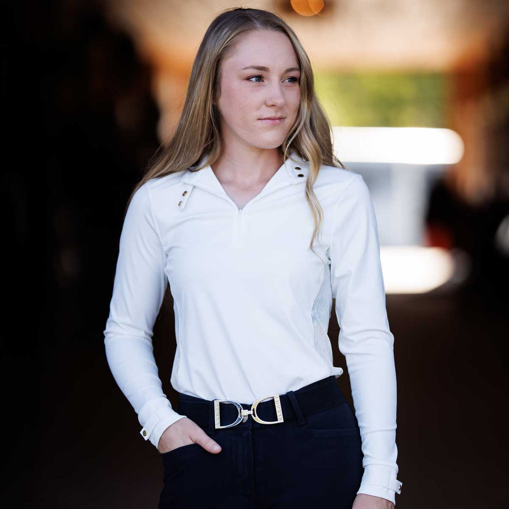 The Macha Sports Nicole Ladies Show Shirt is designed with both comfort and style in mind. This elegant shirt features signature Macha lace detail along with a refined collar and cuff tab secured by snaps. Crafted from premium stretch fabric that offers a flattering athletic fit to allow freedom of movement while maintaining a polished competition-ready look. The Nicole Show Shirt is the perfect blend of refined style and high-performance design that gives riders a polished edge every time they enter the ring.