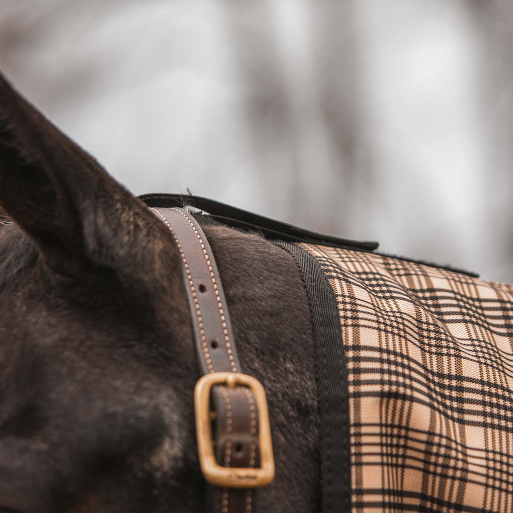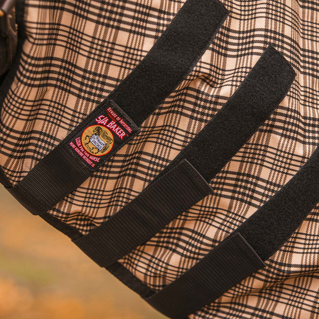 Complete your horse's protection with the 5/A Baker Black Label Neck Cover. Made from the same high-quality 600-denier polyester rip-stop fabric as the Black Label Turnout Blanket, this neck cover offers exceptional durability against the elements. Its satin-smooth lining polishes your horse's coat while the 200-gram Curvofil IV insulation provides added warmth. A waterproof yet breathable membrane ensures water stays out while allowing perspiration to escape. The cover secures with three Velcro snaps along the neck and a fourth snap attaches to the halter, ensuring a snug and secure fit.