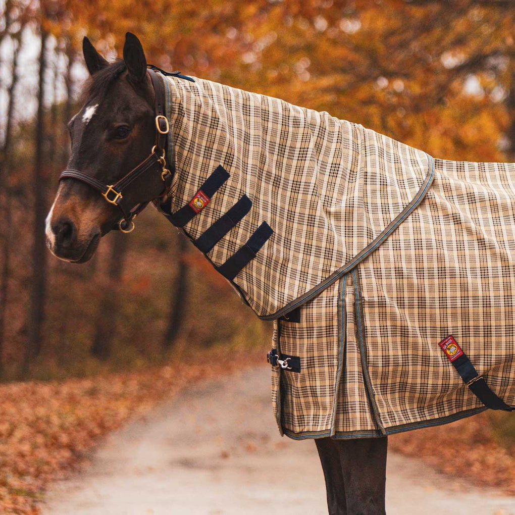 5/A Baker Neck Cover for Turn Out Sheet helps protect your horse against the elements. Waterproof and breathable this Baker Neck Cover is made out of the same high quality material as the Baker Turnout Sheet. The outershell is 1500 denier polyester rip stop fabric and the inner lining is satin smooth to help polish the coat. Breathable membrane allows any perspiration to pass through to the outside. Three EZ pull fasteners allow you to adjust the fit around the neck and there is a fourth fastener at the top to attach to the halter.