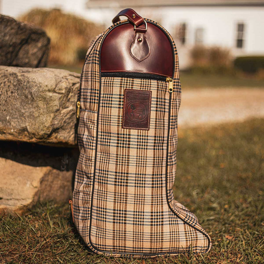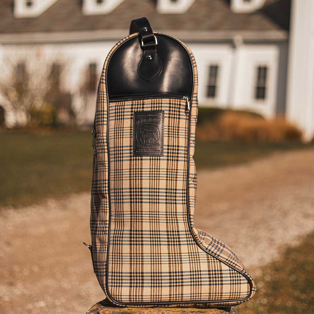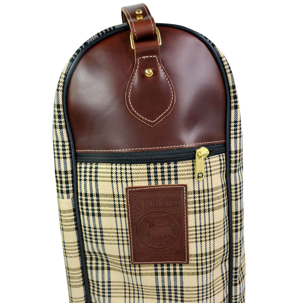 5/A Baker Riding Boot Bag allows you to carry your boots in style with this beautifully finished boot bag by Baker. Made with the original Baker Plaid and trimmed with high quality leather.It is fully lined to protect your boots. Comes in black or brown leather to match your own style.