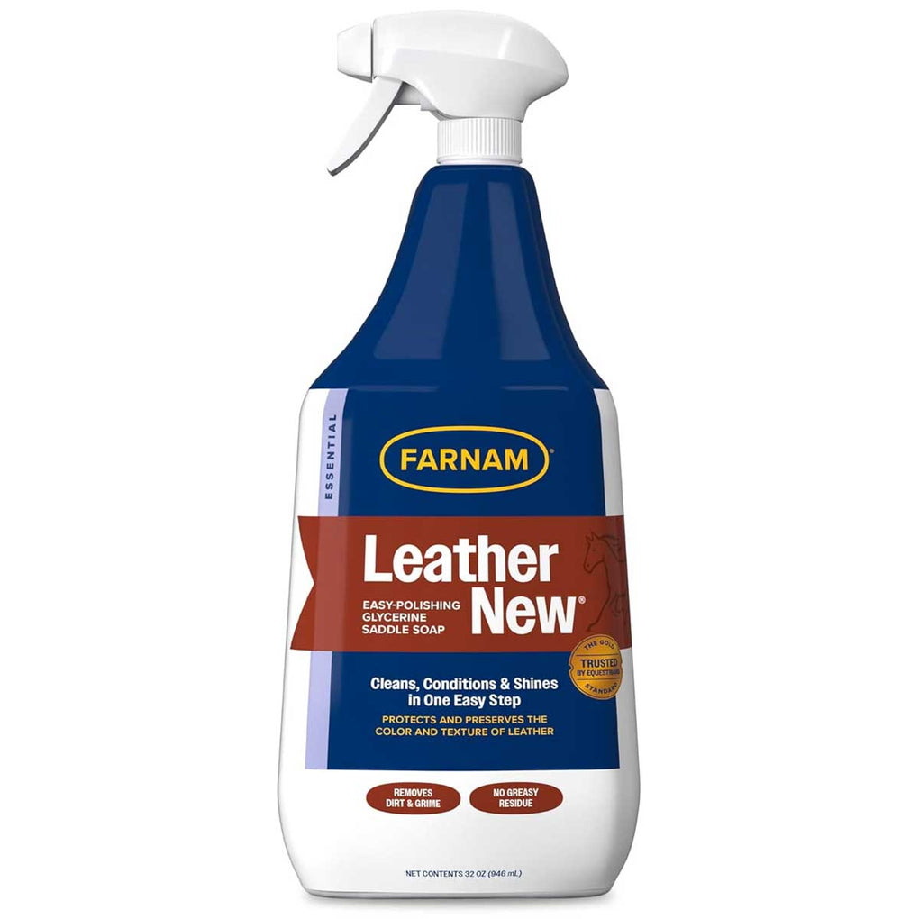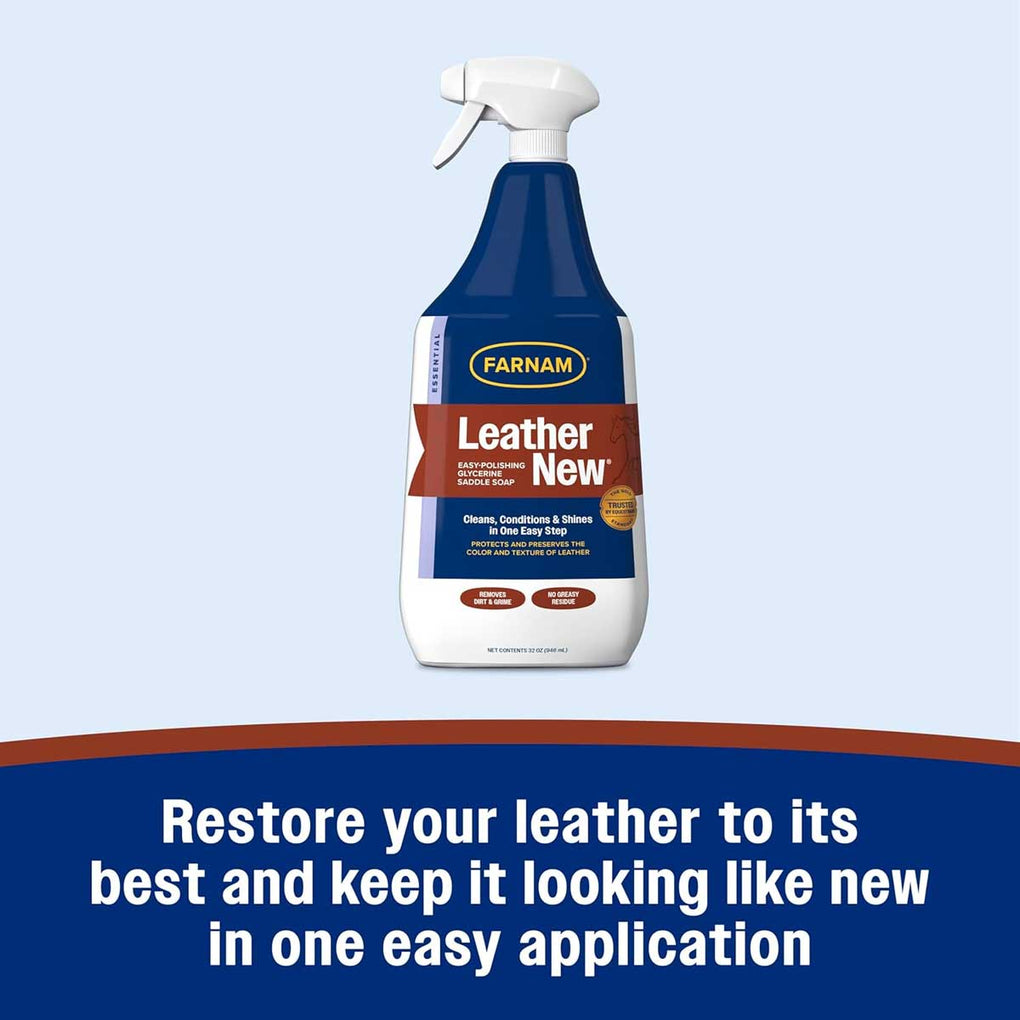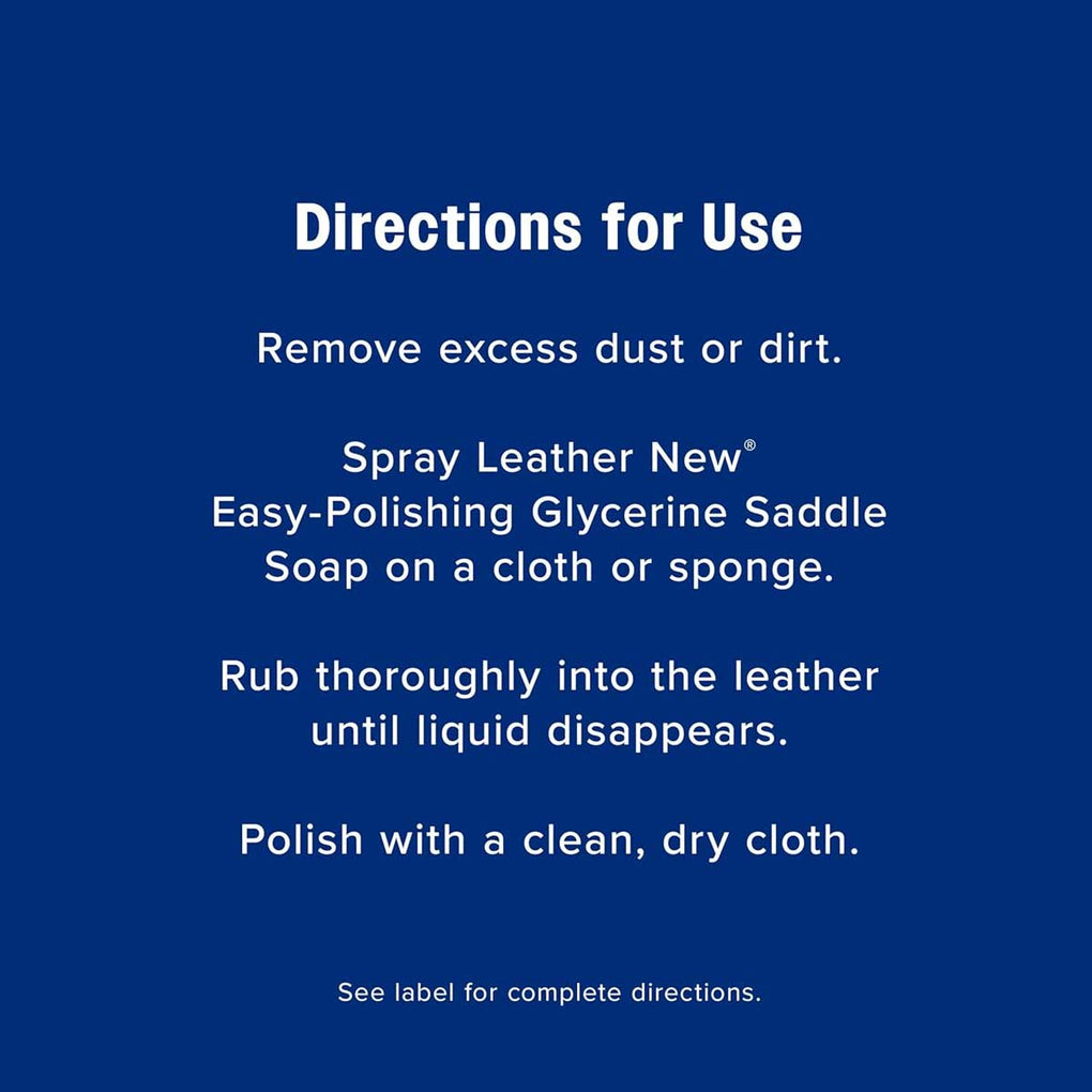 Leather New self-polishing saddle soap is the liquid form of traditional bar glycerine soap. It's easier to use, more efficient and you don't have to add water as you do with bar soap. It makes leather look brand new with a single application. Simply spray it on and rub it in. Cleans, softens and renews leather, then dries to a long-lasting shine.