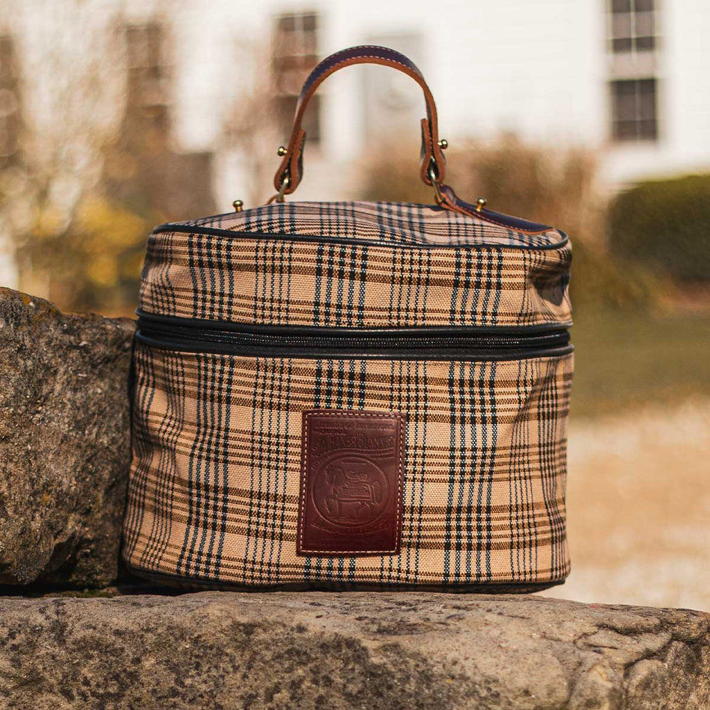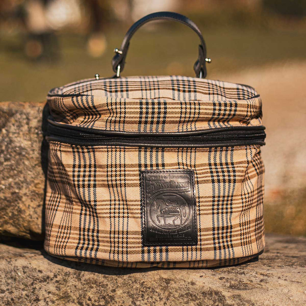 5/A Baker Riding Hat Carrier is a great choice to carry your helmet in style. Fully lined to protect your helmet and trimmed with high quality leather in black or brown. Made with the traditional Baker Plaid.