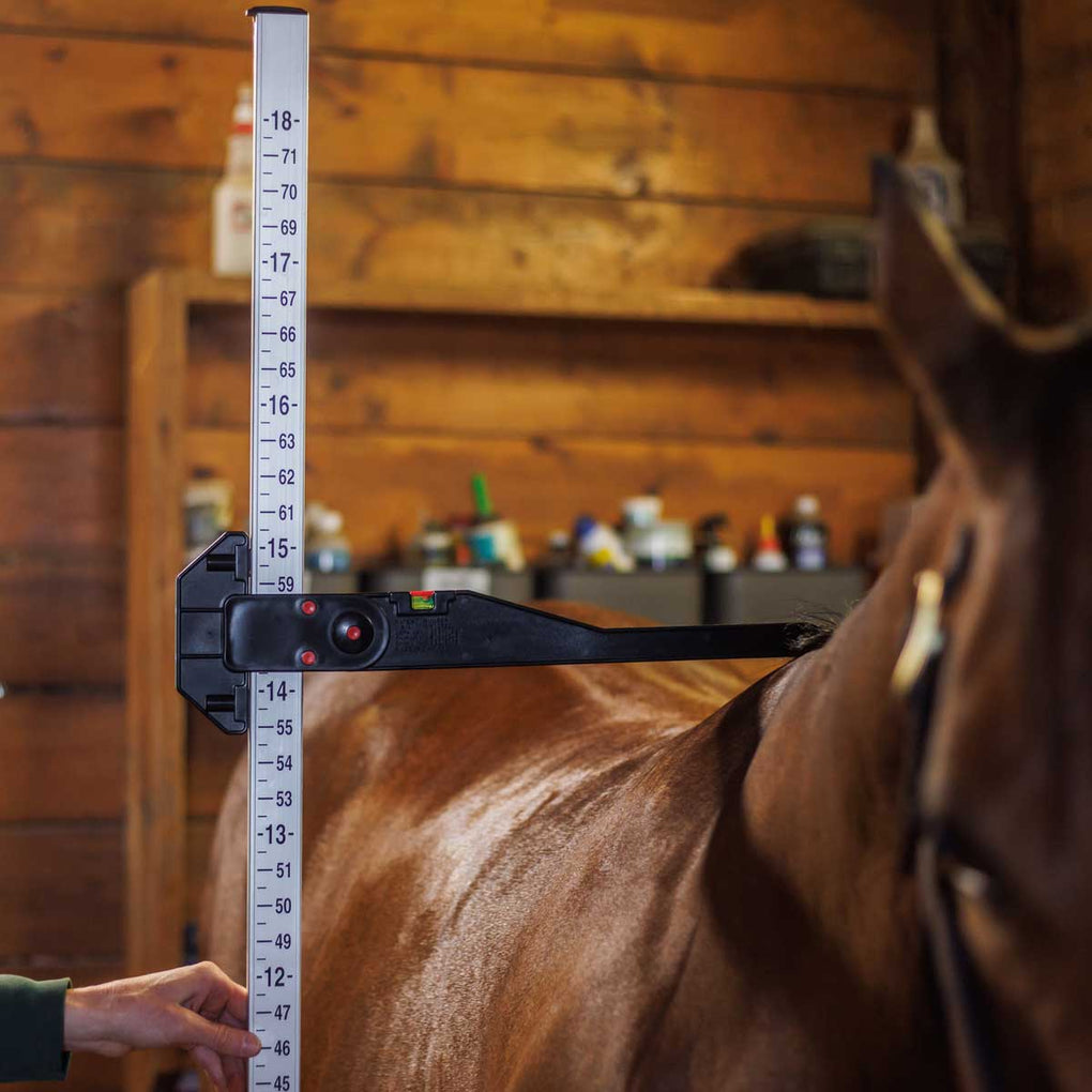Aluminum measuring stick that unfolds with a sliding a lever that will measure the height of the horse or pony from the ground to the withers.